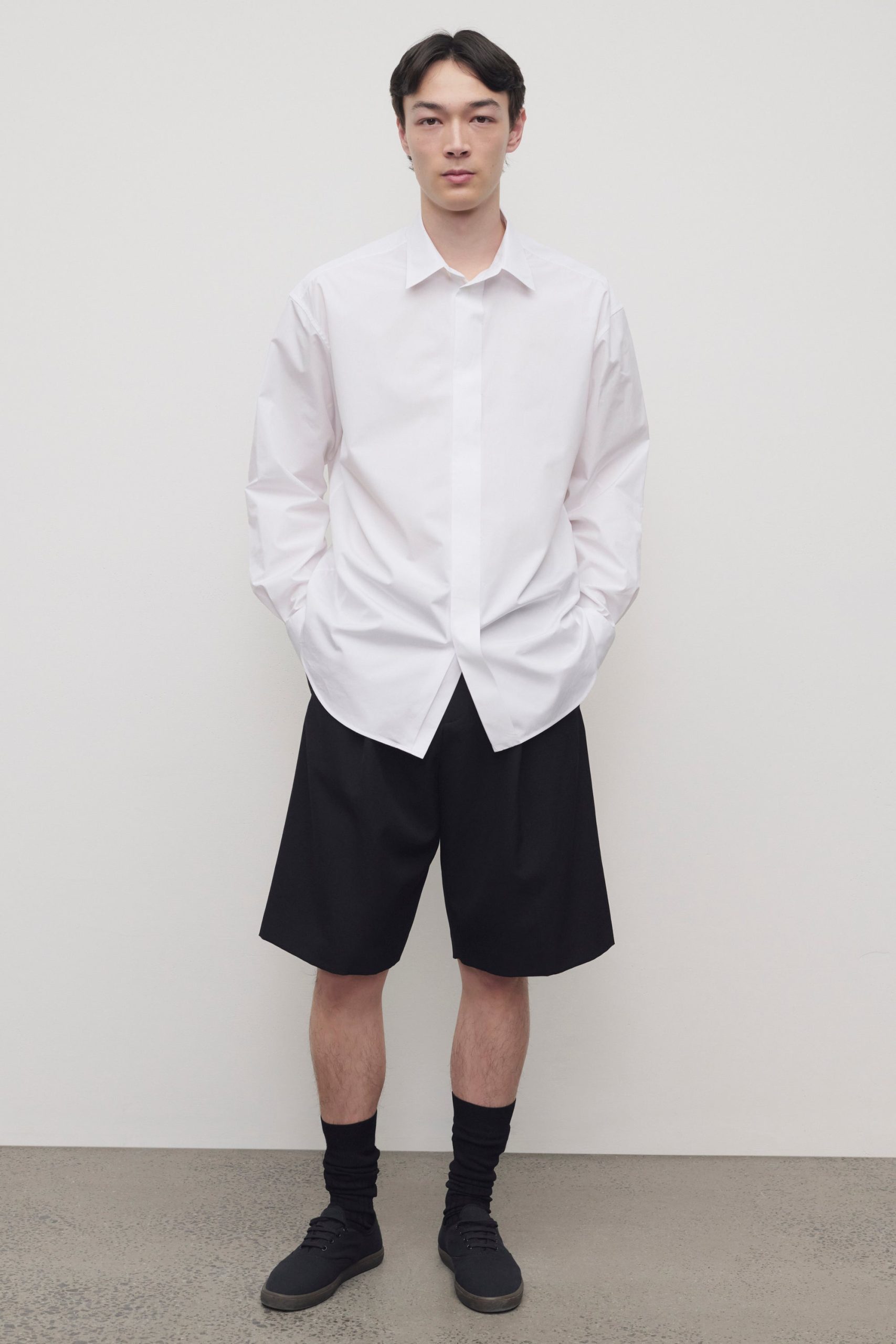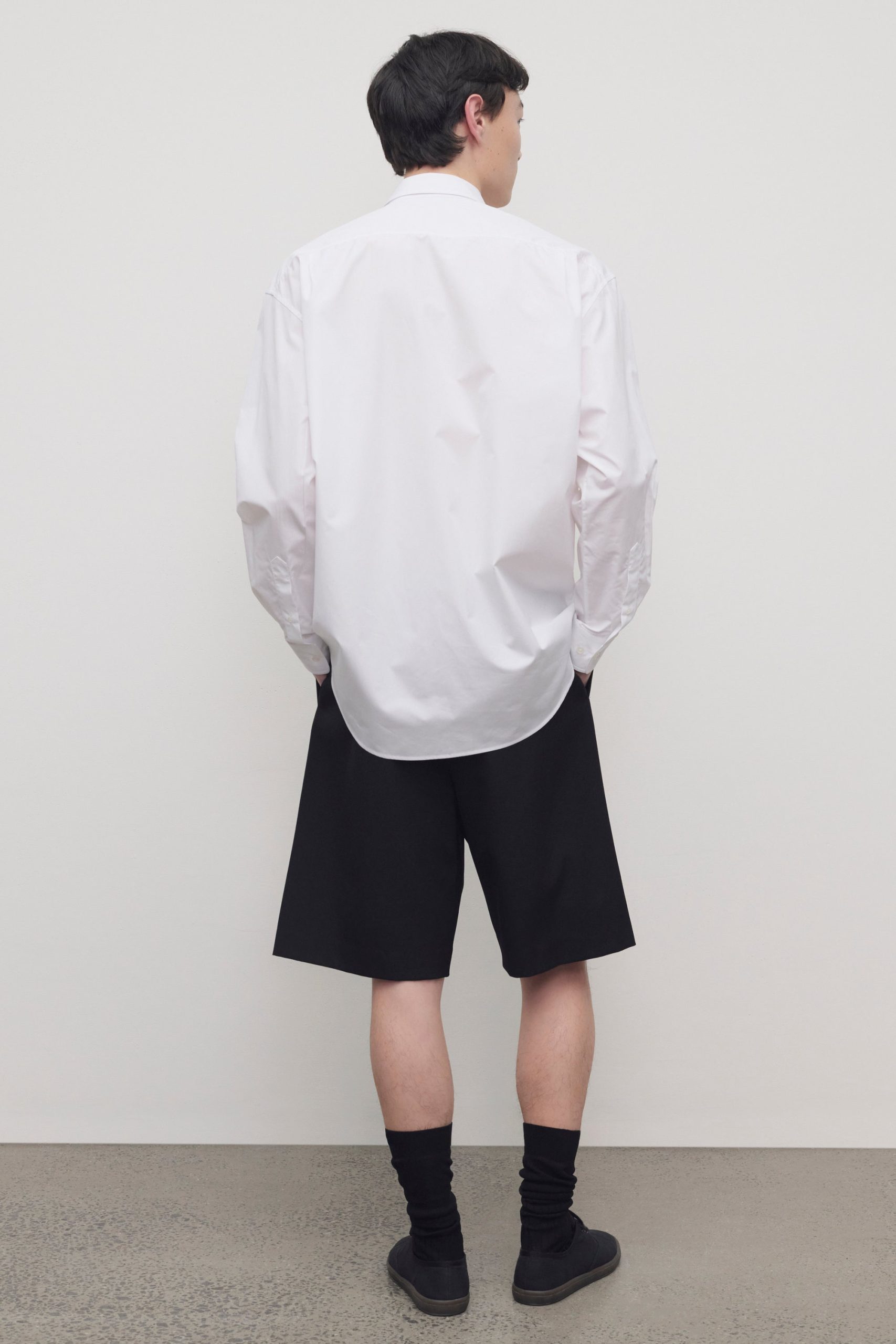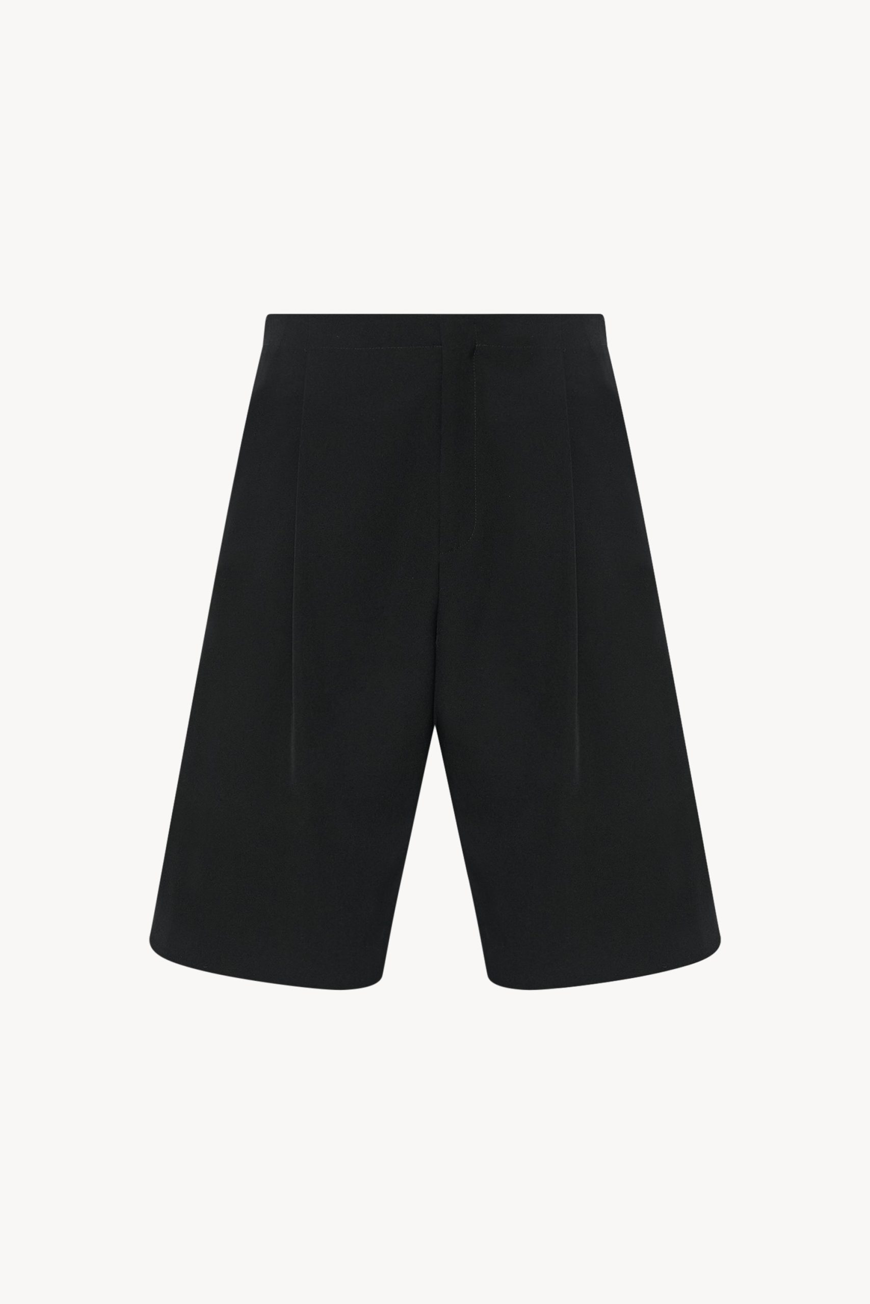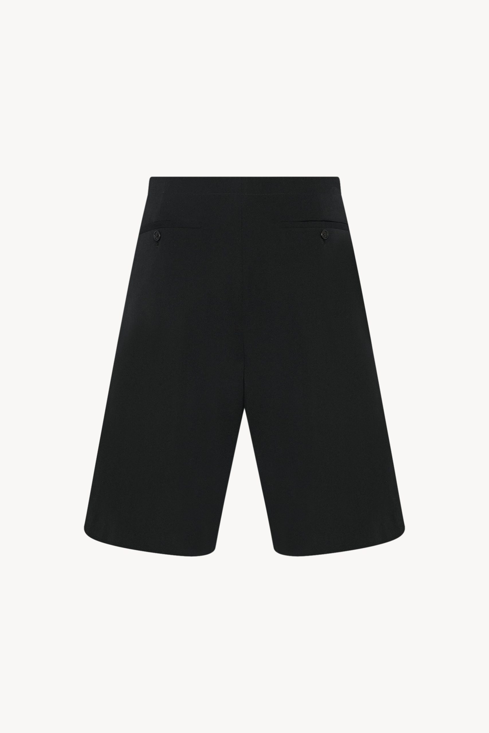Minimal tailored short in soft Japanese wool gabardine with wide leg. seamless side construction. and side welt pockets.