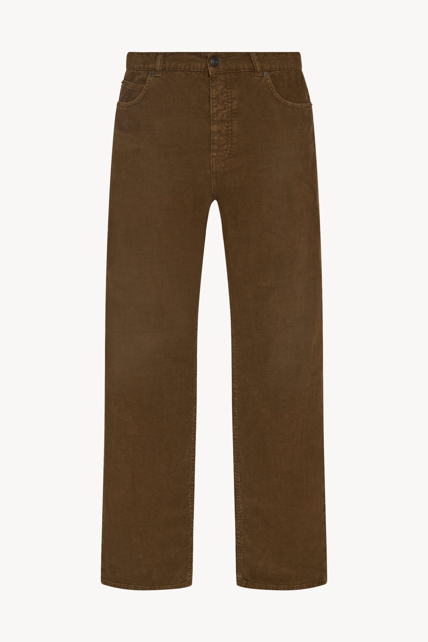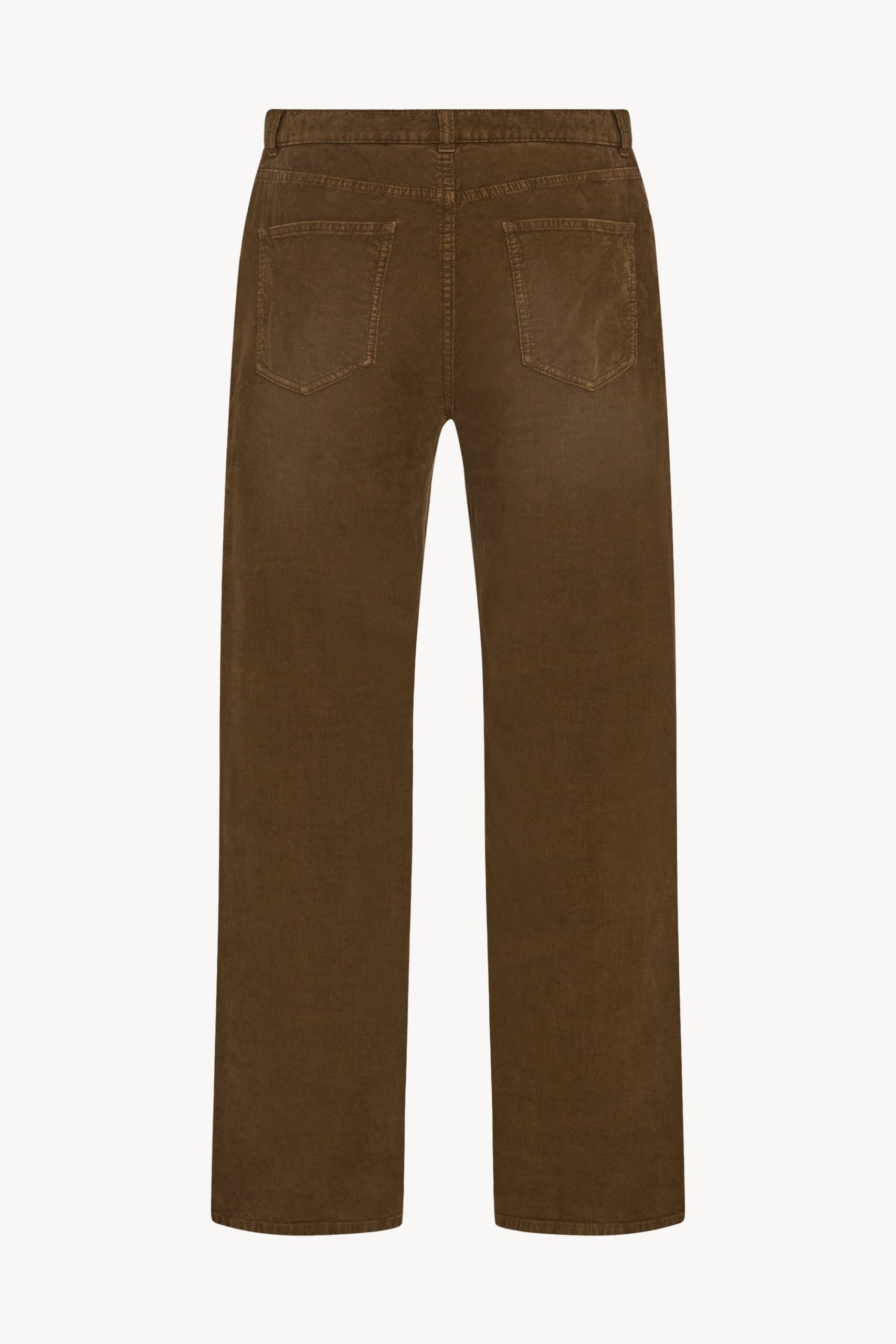 Relaxed mid-rise pant in enzyme-washed cotton corduroy with slight stretch. straight leg. tonal topstitching. and classic 5-pocket construction.