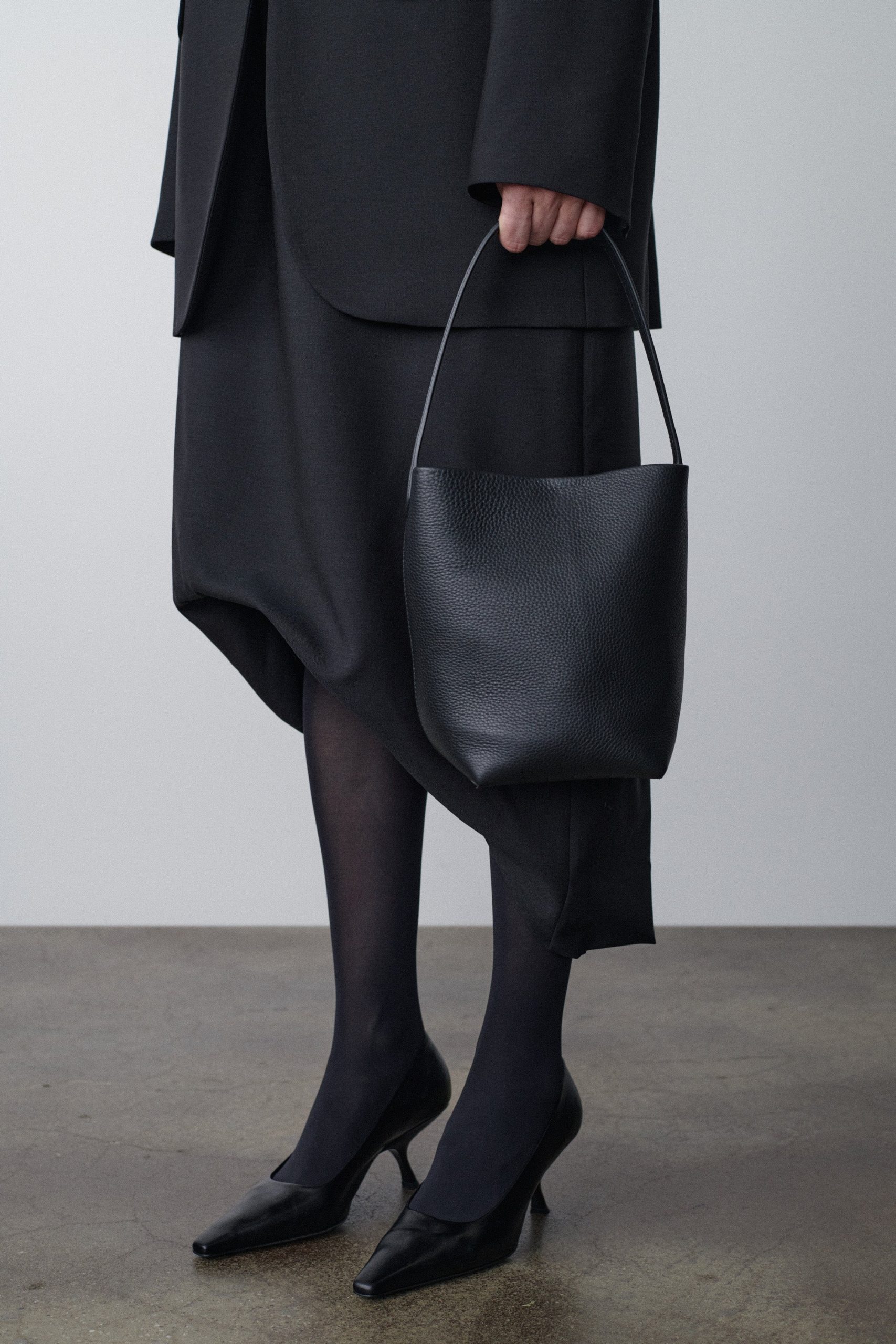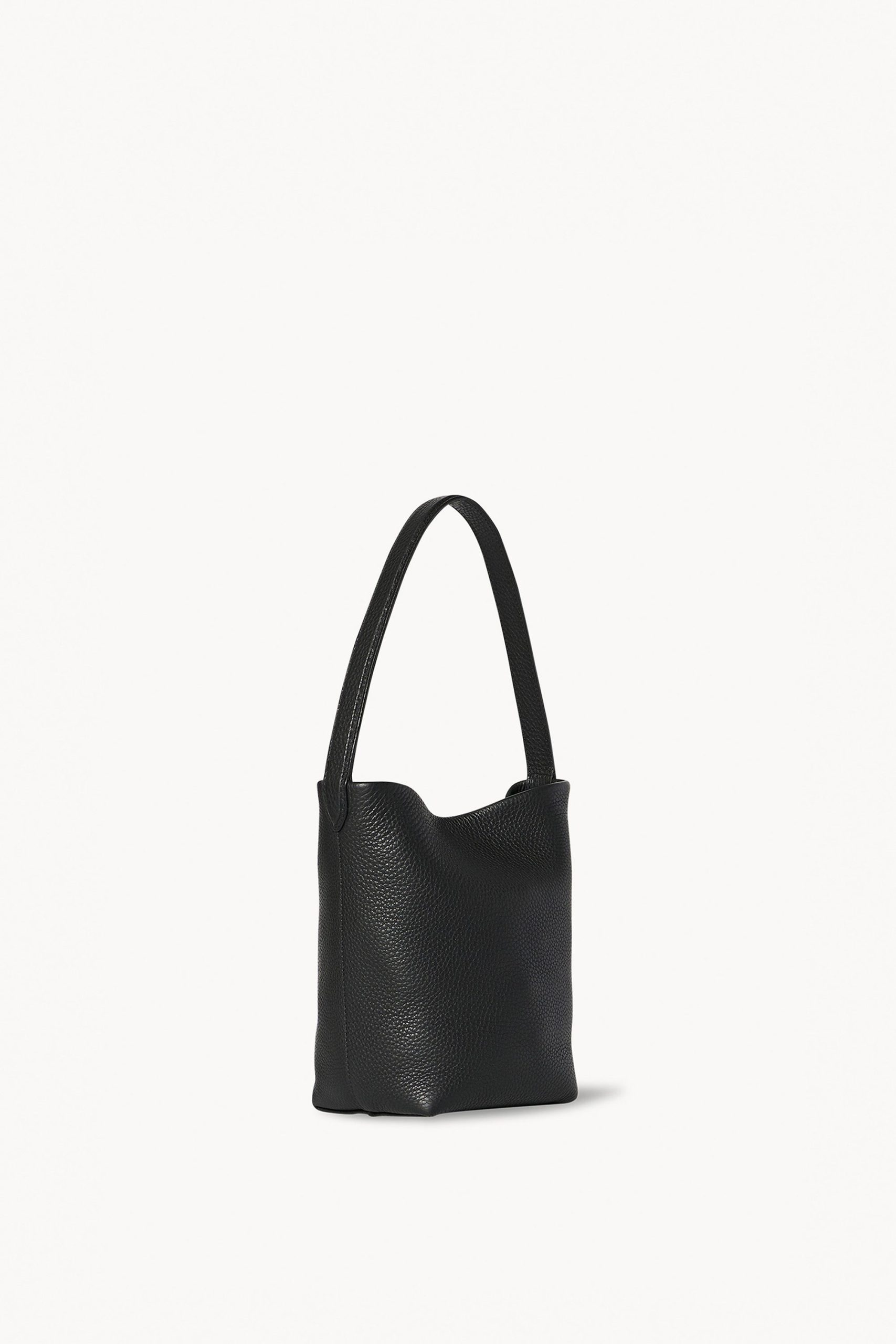 Petite tote bag in grained calfskin leather with softly squared base. flat top handle. and interior leather tie closure.