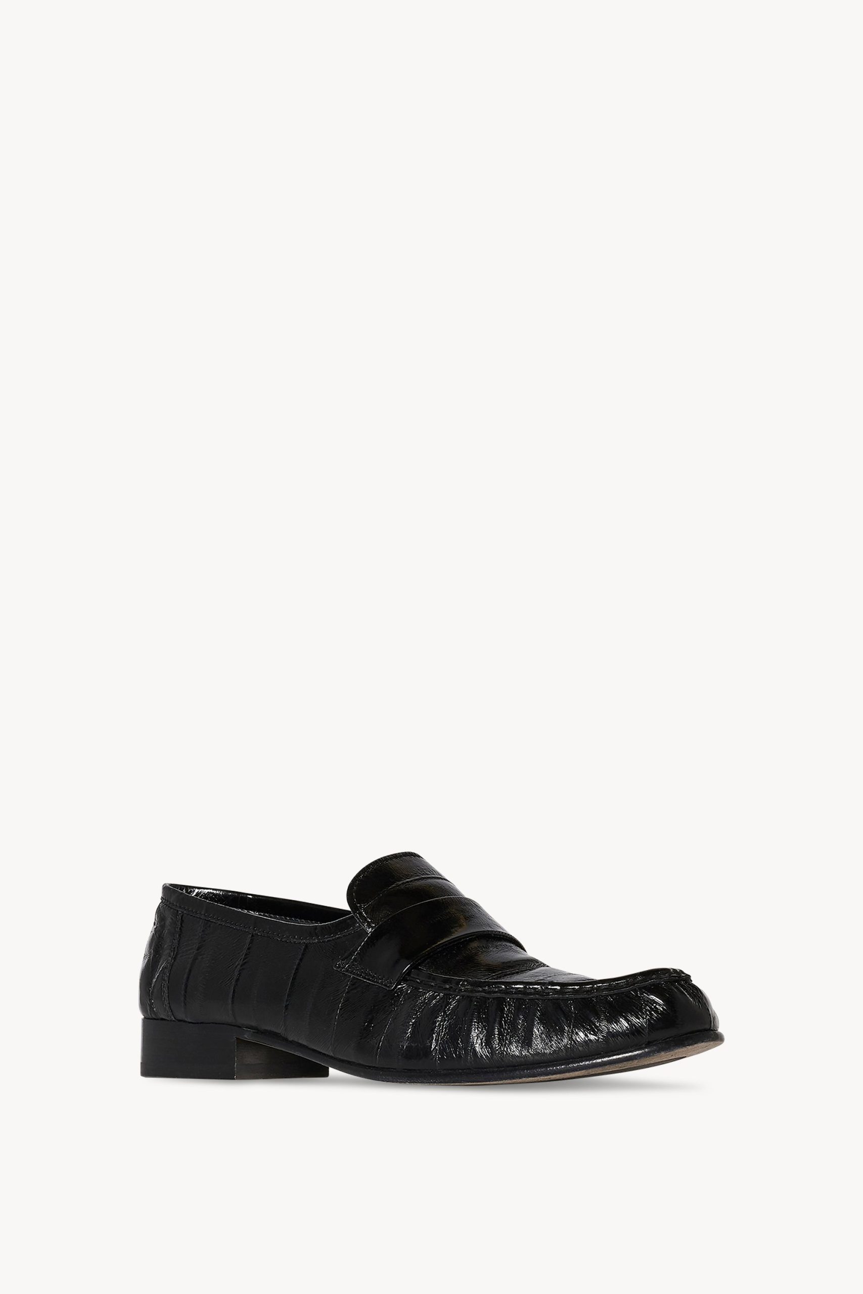 Hand-crafted loafer in polished eel skin leather with pleated outer vamp. curved front strap. and hand-painted leather sole.