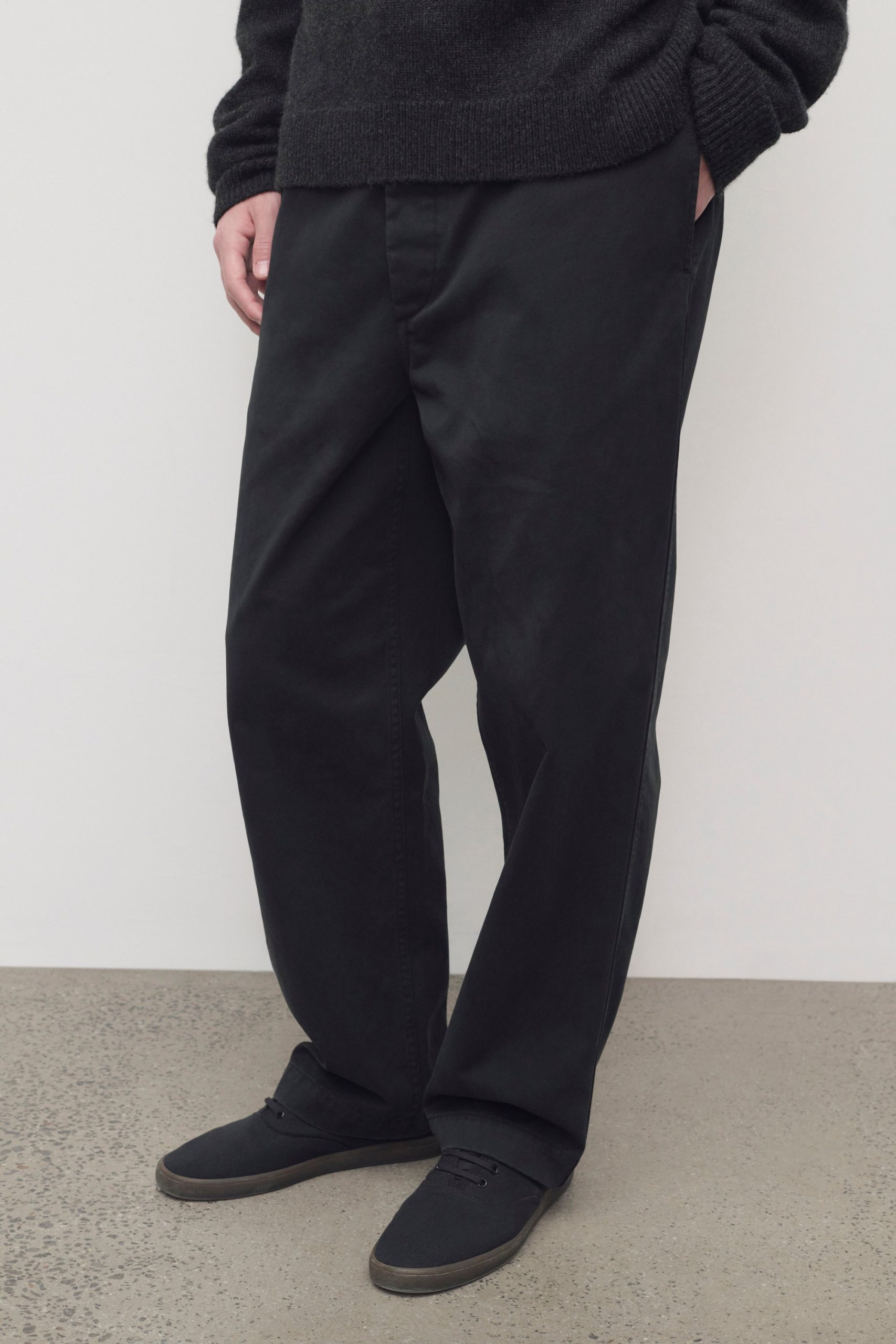 Relaxed mid-rise pant in brushed organic cotton gabardine with straight leg. concealed button fly. and side seam pockets. Characterized by an inherent luster and exceptional smoothness. the fabric offers a refined durability and perfectly worn feel.