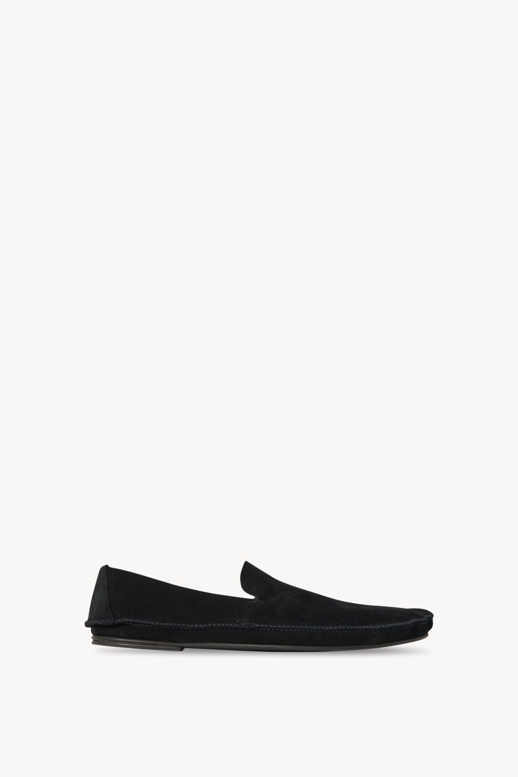 Minimal loafer in soft calfskin suede with oval toe. raised outer stitching. and rubber sole.