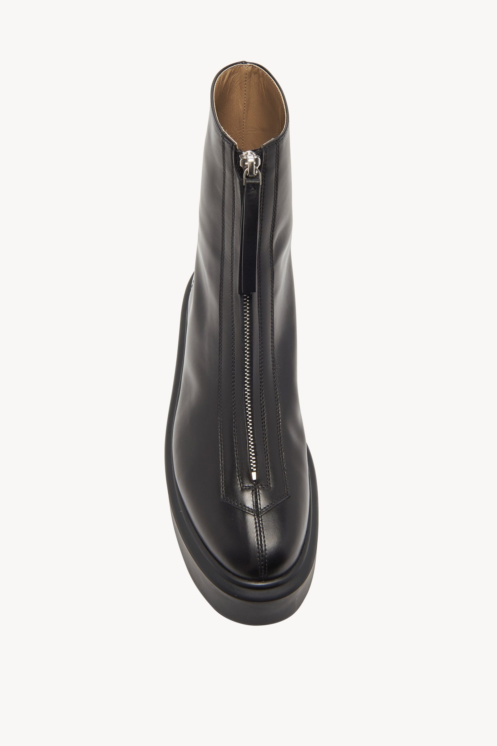 Platform ankle boot in smooth calfskin leather with rounded toe. center front zipper closure. and crepe rubber sole.